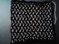 Once the yarn arrived I was able to practice a few swatches...the technique creates a fabric that allows a contrasting color to peek through the dominant color creating a shadow effect shown here: